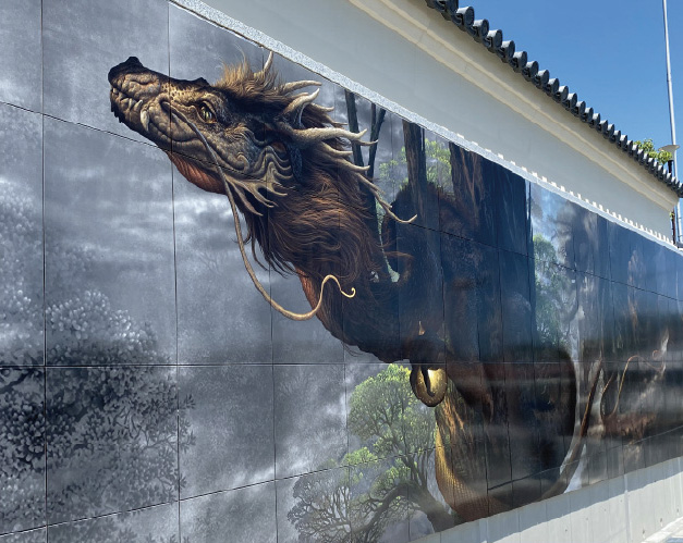 境内の外壁には厄神龍王の巨大壁画。作 内尾和正