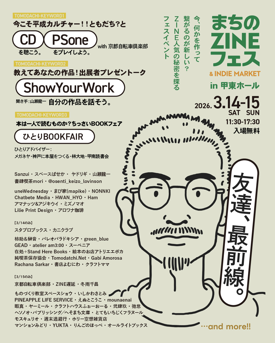50組以上のアーティスト、作家、出版社が甲東園に集結。ZINEと本を中心に、ハンドメイド作品の販売、ワークショップ、トークイベントを実施し、創作と交流が交差する2日間を創出します。 個人による表現の可能性を探り、地域の文化的土壌とゆるやかに接続する試みとして開催される「まちのZINEフェス&INDIEMARKET」が、2026年3月14日(土)・15日(日)の2日間、兵庫県西宮市の甲東ホールにて開催されます。 ZINE(ジン)とは、個人が自主制作する印刷物や冊子の総称です。商業出版とは異なり、テーマや形式、発行部数に制約はなく、作り手の視点がダイレクトに反映されるメディアとして、近年あらためて注目を集めています。プロの作家やイラストレーターはもちろん、学生や会社員など、多様な立場の人々がそれぞれの表現を持ち寄ることができる、ひらかれた創作文化です。 本イベントではZINEを中心に、ハンドメイド、アート作品など、インディペンデントな作品が集結します。大阪・谷町六丁目のブックカフェ「書肆喫茶mori」、兵庫県加東市のひとり出版社「スタブロブックス」など、注目のプレイヤーによる直接販売も。 今回は「友達、最前線」をテーマに掲げたワークショップや古本市「ひとりBOOKFAIR」も実施予定です。友人関係や小さな共同体を出発点に、表現がどのように広がり、支え合い、更新されていくのかを探ります。入場は無料。公共施設という開かれた場所で、個人の創作がどのように社会と接続するのか。その可能性を提示する2日間となります。出展者は開催直前まで募集中。小さな表現が集積することで生まれる、新たな文化の輪郭にご注目ください。 ☆「友達、最前線」関連ワークショップ 【いまこそ平成! CDを聞く会、そして、PSoneをやろう!!!!!!!!!!with京都自転車倶楽部平成カルチャーを再びをウォッチ!会場でCDを持ち寄って】 CDデッキで音楽を聴いたり、京都自転車倶楽部とともに会場でPsoneをしましょう!!聴きたいCDがあったら持ってきてみて。 ※京都自転車倶楽部の参加、Psoneは15日のみ 【Show Your Work!ステージに立って自分の作品を発表しよう。】 ステージに立って自分の作品を発表しよう。 イベント開催中の会場ステージにて、甲東ホール出展者によるプレゼントークの開催が決定!タイムテーブルはSNSで随時公開予定。 【ひとりBOOKFAIR】 ともだちと対比的に「ひとり」とその価値について考える小さなブックフェアです。古書店主や作家らが“ひとりアドバイザー”となり、本と向き合う時間の豊かさを紹介します。